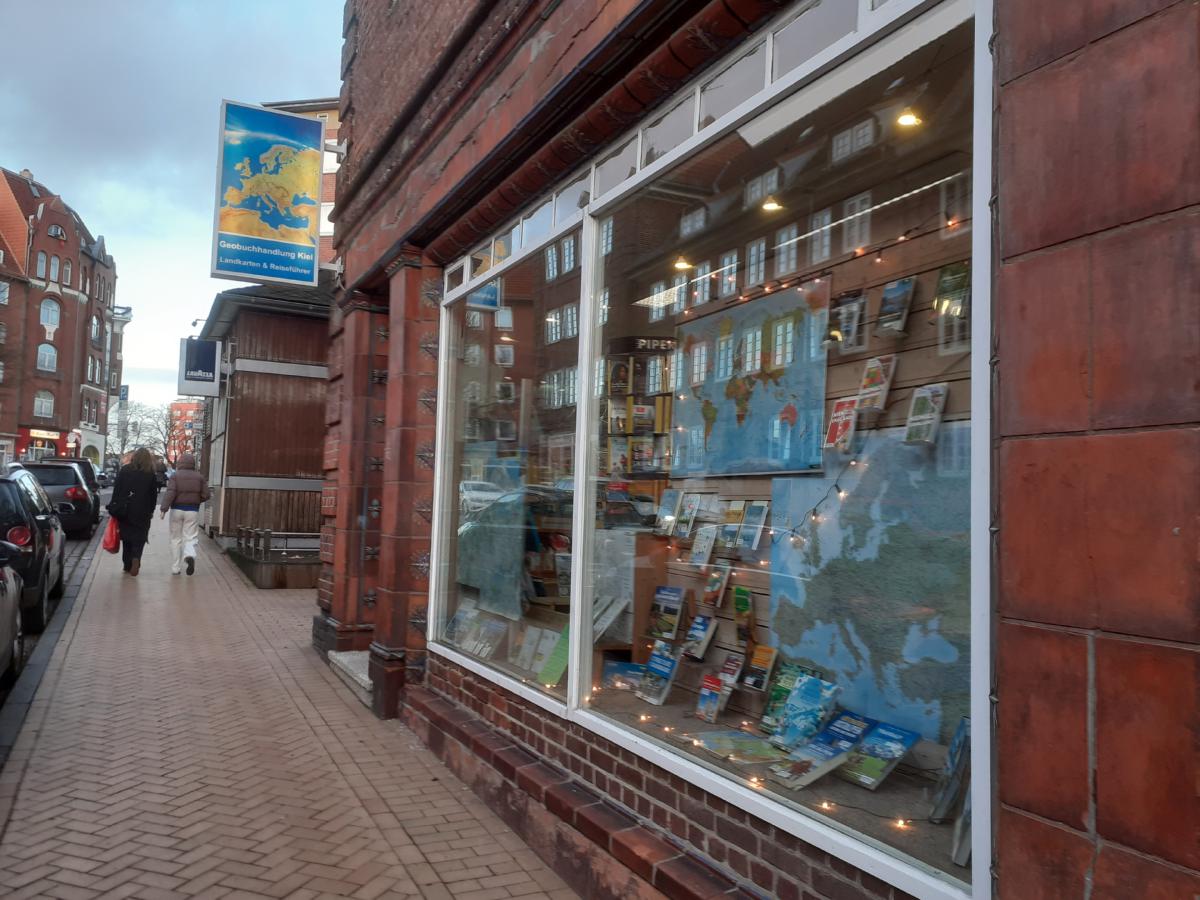 Die Geobuchhandlung Kiel wird geführt von Susanne Eden. Es ist ein kleines Geschäft mit einem großen und aktuellem Angebot an Reiseführern und Landkarten Es liegt am Rande der Kieler Innenstadt, in der Nähe des Exerzierplatzes: